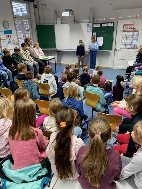Die Kinder zeigen Interesse an den Vollversammlungen und sind aufmerksam bei der Sache. Auch sind sie bereits in der Lage sich selbstbewusst und frei vor der ganzen Schule zu präsentieren.