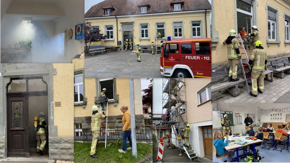 Routiniert öffneten die Feuerwehrmänner Fenster, legten Leitern an und halfen den Kindern, geordnet aus den Klassenzimmern ins Freie zu gelangen. Auch neu angebrachte Holzstufen an der Holzwand erwiesen sich als praktische Fluchthilfe. Schnell versammelten sich die Kinder und Lehrkräfte an den Sammelplätzen.